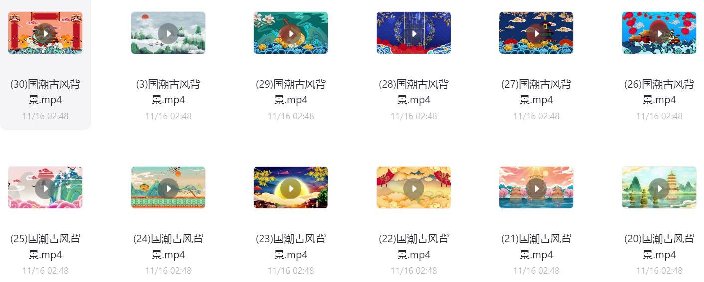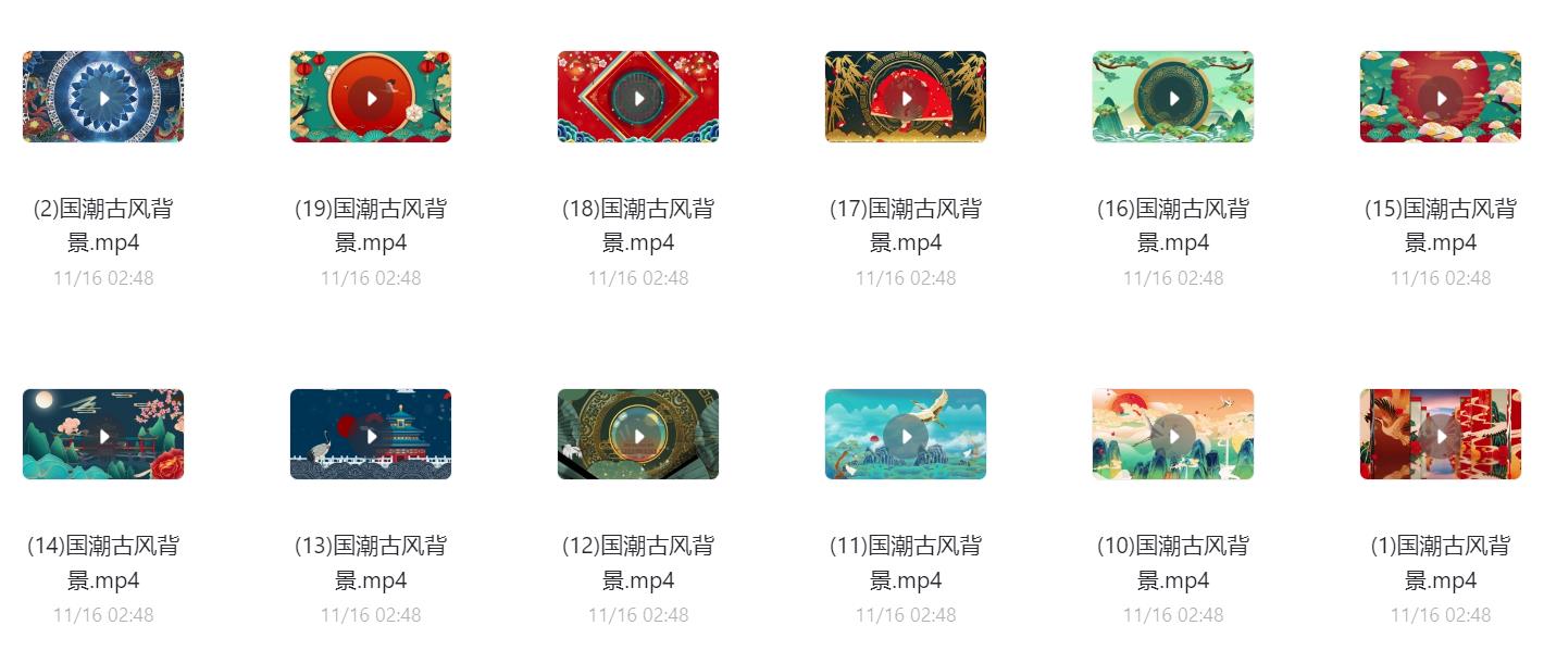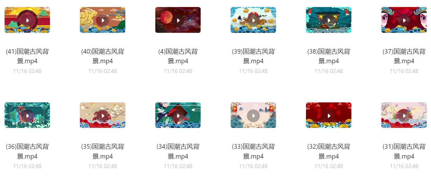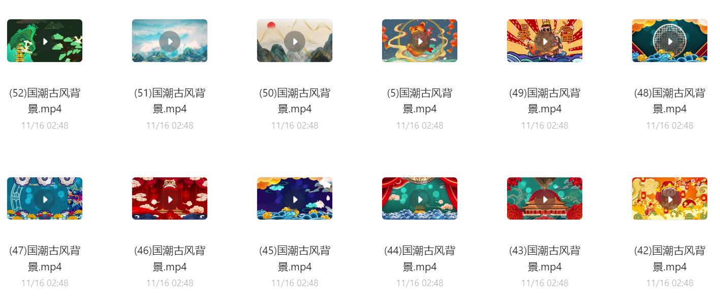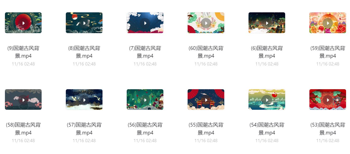 60款国潮古风背景视频素材,阿里云盘和夸克网盘资源下载。可用于古风山水、古风祥云、国潮祥云等动态背景制作或大屏显示,超清无水印。