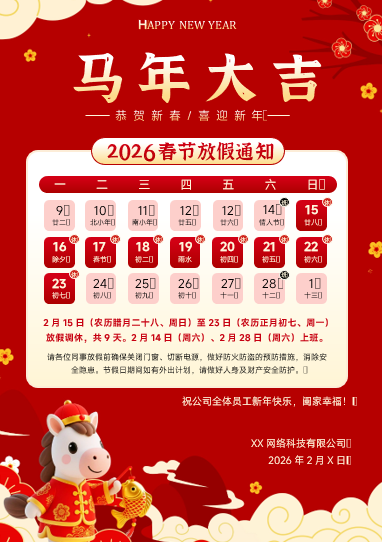 2026 马年春节放假通知全套模板,含可离线编辑 Word 源文件,提供商务、简约、中国风等多款式精美设计,支持一键打印,满足企业、学校、个人等不同场景需求,所有资源免费下载,助您轻松搞定春节假期安排!