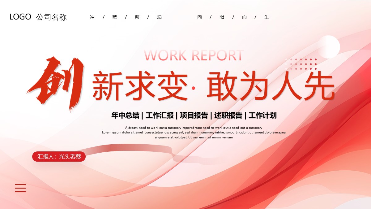 创新求变敢为人先年终工作汇报PPT模板 免责声明 该内容是由网友【mail_85797932】于2026-02-13上传分享到光头老蔡资源分享平台,作品版权和著作权属原作者所有,如果因此侵犯了您的相关权益,请直接联系页面右侧的在线客服及时删除相关内容。