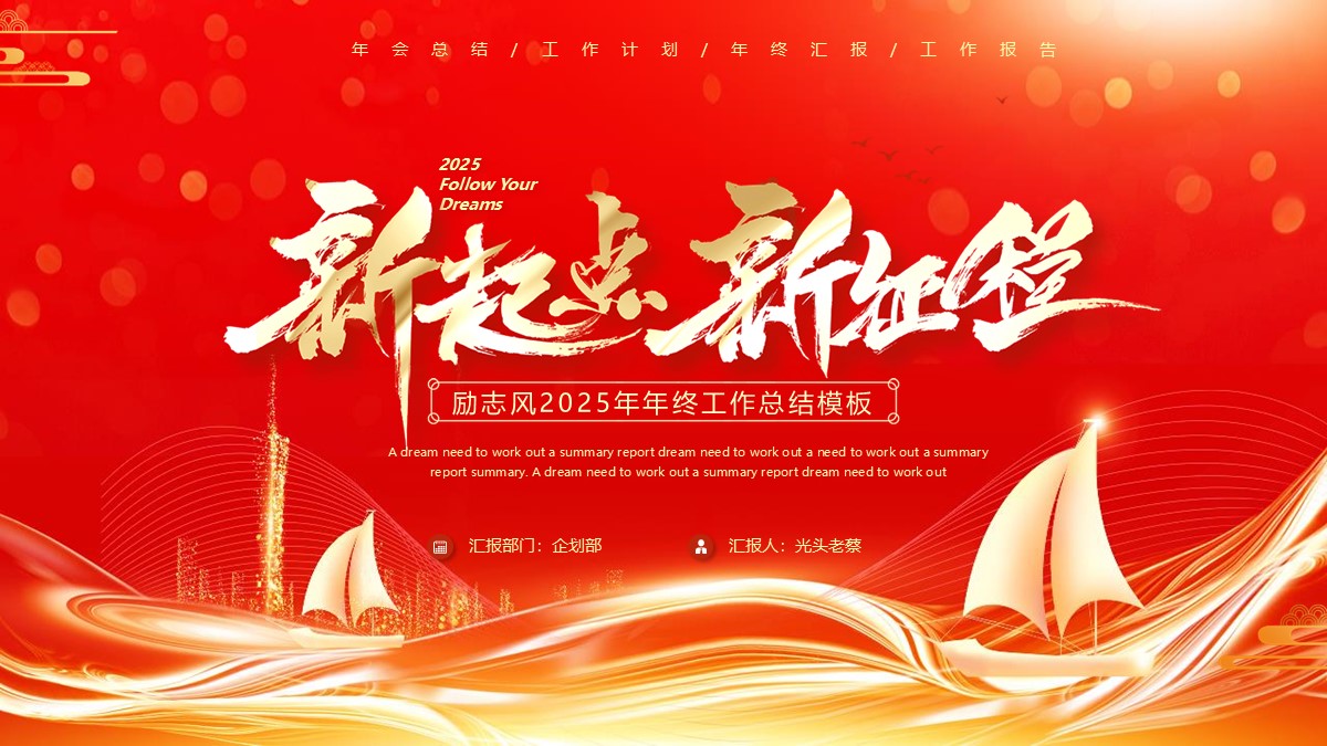 新起点新征程励志风年终工作总结PPT模板 免责声明 该内容是由网友【mail_80255889】于2026-02-17上传分享到光头老蔡资源分享平台,作品版权和著作权属原作者所有,如果因此侵犯了您的相关权益,请直接联系页面右侧的在线客服及时删除相关内容。