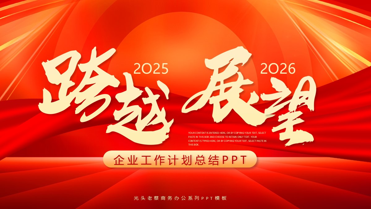 跨越展望企业工作计划总结PPT模板 免责声明 该内容是由网友【mail_31639364】于2026-02-04上传分享到光头老蔡资源分享平台,作品版权和著作权属原作者所有,如果因此侵犯了您的相关权益,请直接联系页面右侧的在线客服及时删除相关内容。